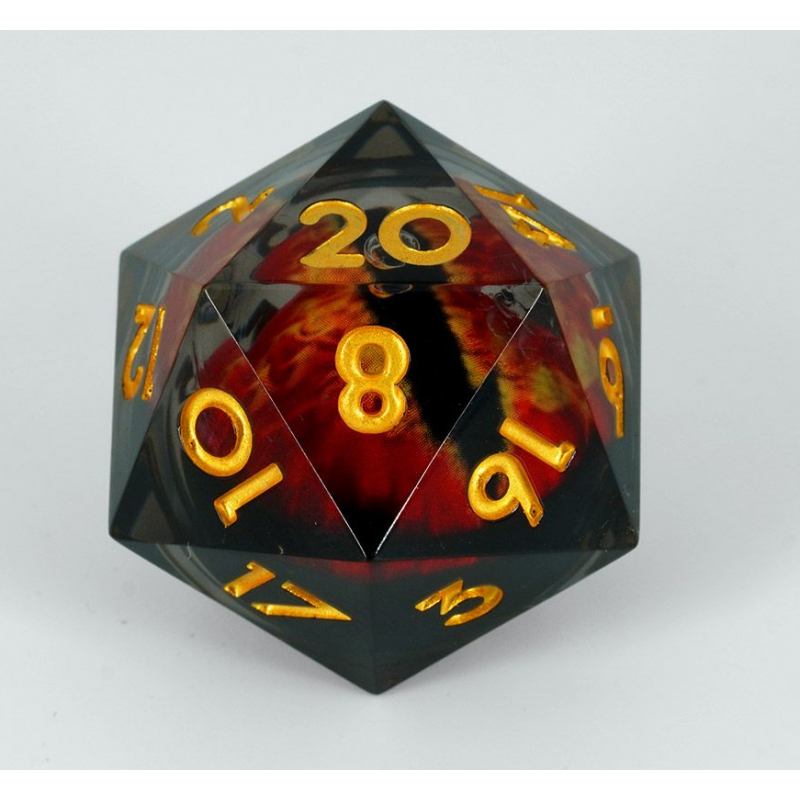 Dado D20 acrílico trasparente con ojo rojo en su interior y números en dorado.