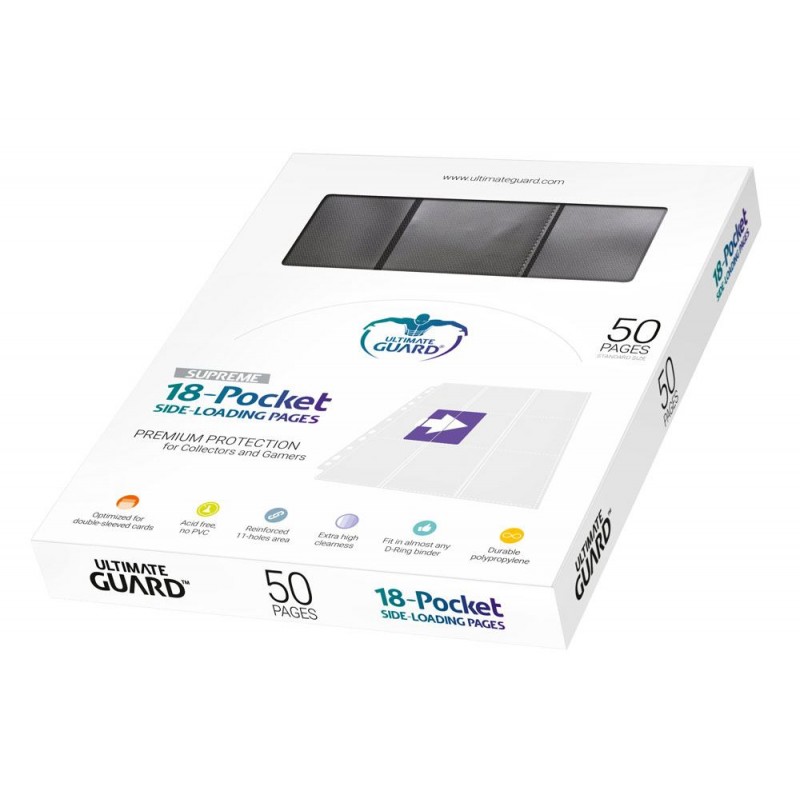 Páginas de doble cara de alta calidad (18 compartimentos;9 en cada lado), que caben en casi cualquier archivador de anillas gracias a sus 11 agujeros con doble perforación reforzada. Perfecto para el transporte y almacenamiento de hasta 18 cartas de colección de doble funda por página. 50 páginas por paquete de un total mínimo de 900 cartas en doble funda .