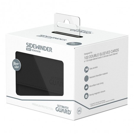 Nuestro práctico estuche para mazos Sidewinder 100+ proporciona un fácil acceso a su mazo de cartas desde ambos lados. La caja está optimizada para contener 100 cartas de tamaño estándar en doble funda o 120 en una sola funda de la marca Ultimate Guard.