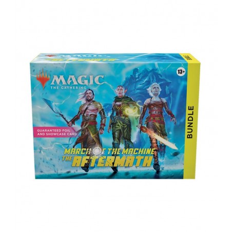 El bundle de Marcha de las máquinas: las secuelas contiene 8 sobres del epílogo de Marcha de las máquinas: las secuelas, que rebosan historia y continúan la trama entre las colecciones. Cada sobre garantiza una carta foil y una resaltada e incluye accesorios como 1 carta promocional foil tradicional con arte alternativo, 40 tierras básicas (20 foil tradicionales y 20 no foil), 1 contador de vidas Spindown sobredimensionado, 1 caja guardacartas y 2 tarjetas de referencia.