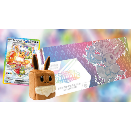 Contiene 1 carta promocional completa con Eevee ex, una caja de mazo, un tapete, 65 fundas y 15 sobres de Pokémon TCG: Evoluciones Escarlata y Violeta Prismático.