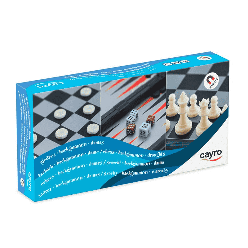 ¡Lleva la diversión y la estrategia a todas partes con el Ajedrez, Damas y Backgammon Magnético de Cayro! Este versátil set 3 en 1 te permite disfrutar de tres clásicos juegos de mesa en un solo y práctico tablero magnético, diseñado para mantener las piezas en su lugar incluso en movimiento.