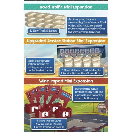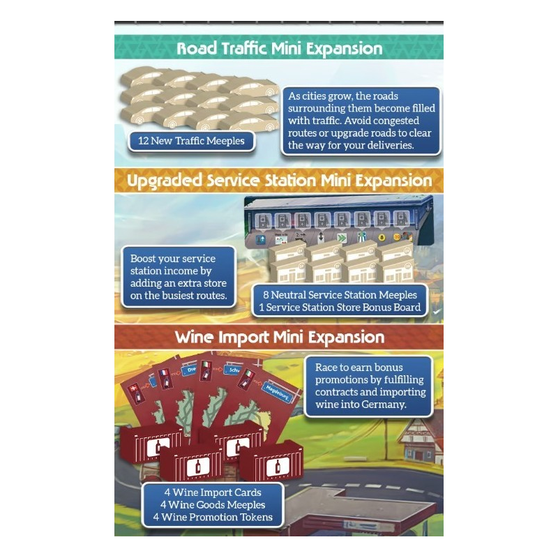 El Kickstarter Pack del Autobahn incluye las mini expansiones Road Traffic, Upgraded Service Stations y Wine Import.