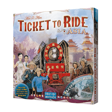 Presentamos la Colección de Mapas de ¡Aventureros al Tren!, una nueva serie de expansiones para este juego que incluyen dos mapas diferentes en un solo tablero de doble cara. ¡Aventureros al Tren! Asia es el primer volumen de esta línea, y ha sido diseñado para partidas de hasta 6 jugadores, en las que un compañero y tú competiréis contra otros equipos en un salvaje recorrido de 25.000 Km. desde Kabul hasta Pekín, a través de las estepas de Mongolia y el desierto del Gobi, hasta el río Amarillo. O, si prefieres los sosegados placeres del viaje en solitario a lo largo de la Ruta de la Seda, o encontrar tu camino en el bullicio de Indochina, aventúrate en la Asia Legendaria… pero prepárate para un aterrador itinerario a través de los pasos montañosos del Himalaya. Además de los 2 mapas, los Billetes de Destino y el libro de reglas, ¡Aventureros al Tren! Asia también incluye 6 atriles de madera para las cartas, así como 45 vagones de tren en miniatura (9 de cada uno de los 5 colores habituales), necesarios para el juego en equipo.