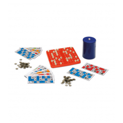 Cada vez que friccionas el bote de arriba abajo, sale una bola, colócala en la plantilla y ves cantando números a ver si tenemos suerte y nos toca alguna ¡LINEA Ó BINGO! Lleva 48 cartones diferentes y un montón de fichas para marcar los números que van saliendo.