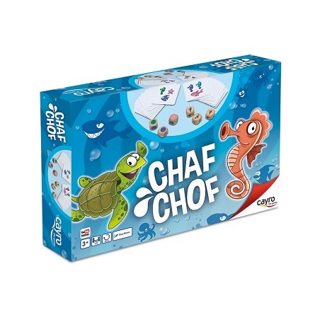 Chaf Chof es un juego de agilidad y rapidez visual. Lanza los dados y sé el más rápido en encontrar la tarjeta con la misma combinación de animales o de colores. Tienes la posibilidad de jugar con colores o con formas y además las instrucciones incluyen una variante de juego a partir de 2 años.