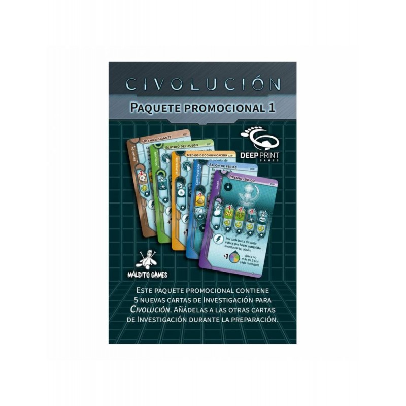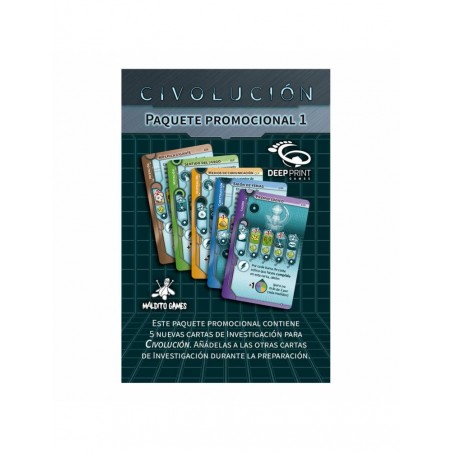 Este paquete promocional contiene 5 nuevas cartas de investigación para Civolución. Añádelas a las otras cartas de investigación durante la preparación.