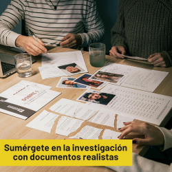 MÁS DE 40 DOCUMENTOS Y FOTOS DE INVESTIGACIÓN: El juego de mesa contiene artículos de periódico, fotografías de la escena del crimen, informe de pruebas, registros telefónicos, informe forense, mapa de la escena del crimen y de la ciudad, documentos legales, interrogatorios de sospechosos, declaraciones de testigos, fotografías de personajes, conversaciones privadas y mucho más.