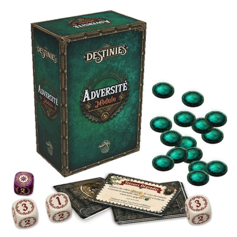 Destinies: Adversidad es la expansión del juego de mesa Destinies, la cual añade recompensas de providencia con desafíos y bendiciones de adversidad. Al principio, selecciona al azar una Carta de Providencia para ofrecer recompensas a los aventureros más valientes. Pero… se robarán nuevas Cartas de Adversidad que afectarán a los jugadores y os enfrentaréis a nuevos retos y dificultades que tendréis que superar.