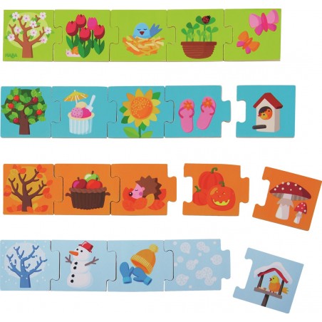 ¿Qué flores florecen en primavera y cuáles en verano? ¿Qué frutas pueden recolectarse en otoño y qué cosas pueden hacerse fuera durante el invierno? En este juego, los niños asignan cada una de las 4 fichas de árboles a sus correspondientes fichas de motivos.