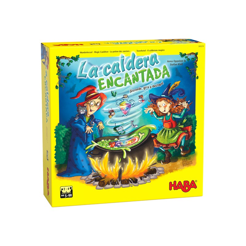 Contenido: 1 caldera encantada (consistente en: base de la caja del juego con lámina, cruz, suelo, disco giratorio, lámina transparente con símbolos y tablero),1 figura giratoria, 4 aprendices de mago de madera, 4 marcadores, 20 fichas de ingredientes (huevas de sapo, hongo de rana, espina de pez león, gusanos, cristal de dragón; cada uno en 4 colores), 36 fichas de brebajes, 12 monedas mágicas y las instrucciones del juego.