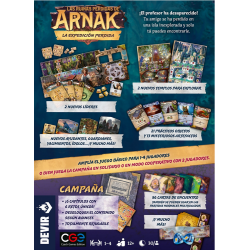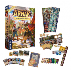 Las Ruinas Perdidas de Arnak: La expedición perdida es la esperada segunda expansión del multipremiado juego Las Ruinas Perdidas de Arnak. Diseñado por Elwen y Min, incluye nuevos componentes que se añaden al título base para multiplicar las posibilidades estratégicas a disposición de los jugadores. En Las Ruinas Perdidas de Arnak, cada jugador controla un equipo de exploración que deberá desentrañar los misterios de la isla. Combinando las mecánicas de colocación de trabajadores y construcción de mazos, los jugadores deberán recolectar recursos, enfrentarse a poderosas bestias y avanzar en la investigación de un templo perdido. Esta nueva expansión está pensada para usarse de dos maneras: añadiendo un montón de componentes al juego base, que permite partidas en solitario o en grupos de hasta 4 jugadores, o bien jugar en modo campaña, que incluye seis capítulos para disfrutar en solitario o en pareja, de modo cooperativo. Entre los nuevos componentes que añade La expedición perdida encontramos 34 nuevas cartas (21 objetos y 13 artefactos), 8 ídolos, 5 yacimientos, 4 asistentes, 3 guardianes, 2 líderes de expedición (para combinar con la primera expansión del juego o para probar la dinámica de los líderes, si no has jugado nunca con este módulo) y dos nuevos templos alternativos, que modifican el tablero central y la dinámica de investigación que se lleva a cabo con la lupa y la libreta de notas. Los dos nuevos líderes son el periodista y la mecánica. Cada uno de ellos cuenta con un set de reglas específico, que alteran ligeramente la partida: el periodista recibirá más recursos en función del número de artículos que vaya publicando (y podrá superar la lupa con la libreta en el track de investigación) y la mecánica contará con un ayudante especial, el mono Rusty, así como con un engranaje especial que le dará beneficios en la exploración de la isla. La principal novedad que incorpora la expansión La expedición perdida son los dos nuevos templos disponibles: el templo de la catarata y el templo del árbol, que se usan durante la campaña, pero también dan variabilidad a las partidas del juego base. El templo de la catarata oculta misterios tras las cortinas de agua, desde atajos hasta incluso un nuevo sitio arqueológico. Por su parte, el templo del árbol dará a los jugadores la posibilidad de llevar a cabo rituales ancestrales usando ídolos. ¡Prepárate para descubrir los nuevos misterios que aguardan en Arnak!. Como exploradores curtidos deberéis afilar vuestro ingenio para superar los nuevos retos, en combinaciones nunca vistas de cartas y componentes. Nunca dos partidas volverán a ser iguales con esta segunda expansión. ¡Lleva el juego a otro nivel!