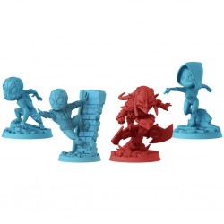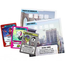 3 miniaturas de Héroe, 1 miniatura de Villano, 6 Lugares, 36 cartas de Héroe, 1 tablero de Villano, 12 cartas de Plan maestro, 6 cartas de Amenaza, 1 carta de Desafío, 15 fichas, 1 hoja de reglas.