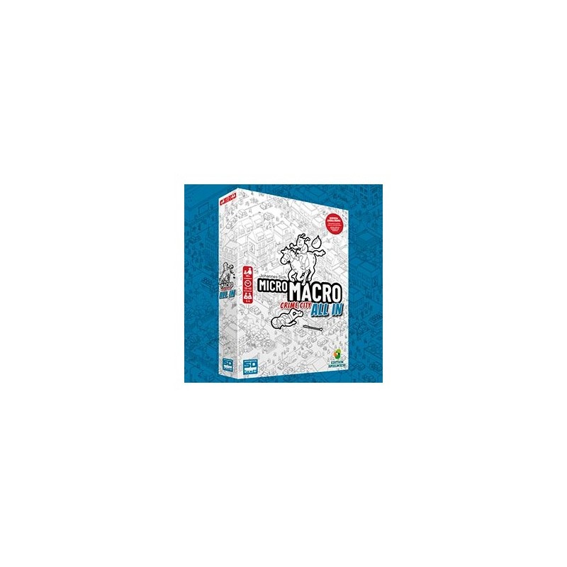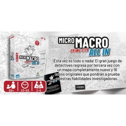Bienvenidos a Crime City, una ciudad donde el crimen acecha en cada rincón. Aquí, los secretos mortales, robos sigilosos y asesinatos a sangre fría son el pan de cada día. Full House es la segunda parte de la serie MicroMacro: Crime City. En esta tercera entrega te espera un nuevo mapa de la ciudad con 16 nuevos casos. All In es un juego independiente, así que no necesitas tener el juego original para poder resolver los casos incluidos en este juego. MicroMacro es un juego cooperativo de detectives. Juntos resolveréis intrincados casos criminales, averiguaréis cuáles han sido los motivos, encontraréis pruebas y encarcelaréis a los culpables. Un ojo perspicaz es igual de importante que una deducción ingeniosa. Este es un trabajo para ¡verdaderos detectives!