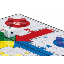 Tablero de parchís que se dobla por la mitad para convertirse en un estuche y así que se puedan guardar las fichas. La superficie es metálica y las fichas magnéticas, así que junto a su reducido tamaño lo hacen ideal para viajes. Podrás jugar en movimiento y no se te caerá ninguna ficha.