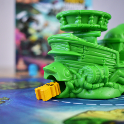Fase de navegación: Deslízate tu panda pirata de la nave de tortugas en el centro de la escalera y gana una moneda si aterrizas en el centro de una isla. Activa un minijuego de la isla con más meeples.