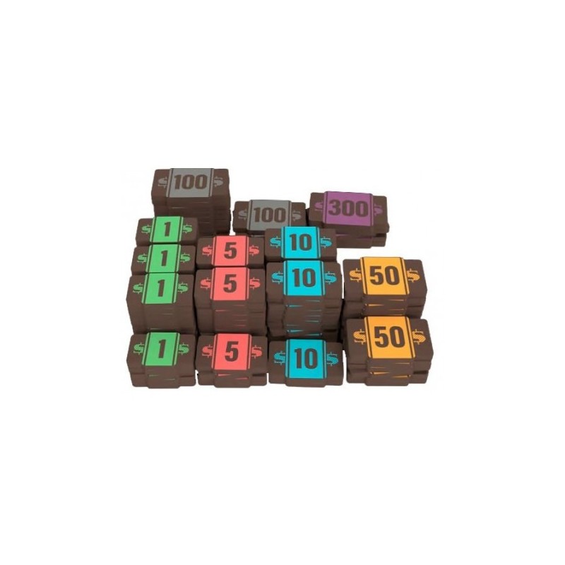 Incluye 116 fichas de madera serigrafiadas de doble cara en seis denominaciones ($1, $5, $10, $50, $100 y $300) como mejoras a la moneda perforada en Speakeasy. Cada banda de billetes tiene 4 mm de grosor y tiene el mismo tamaño y forma que la moneda perforada del juego. El conjunto se entrega en una bolsa de tela temática con cierre de cordón.