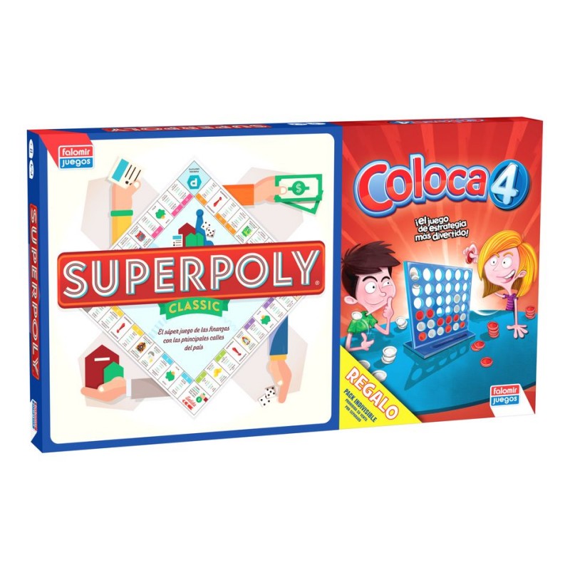 Estupenda combinación: 2 x 1. Superpoly: ¿Quieres pasar un rato entretenido? Con Superpoly, hazte con todas las propiedades posibles para ganar. Con las principales calles del país. Coloca 4: Entretenido y absorbente juego de estrategia vertical. El objetivo es ser el primero en colocar una fila de cuatro fichas de un mismo color, ya sea horizontal, vertical o diagonal.