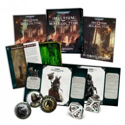 La Caja de iniciación de Imperium Maledictum contiene todo lo que necesitas para empezar tus sombrías y peligrosas aventuras en el juego de rol de Warhammer 40.000.