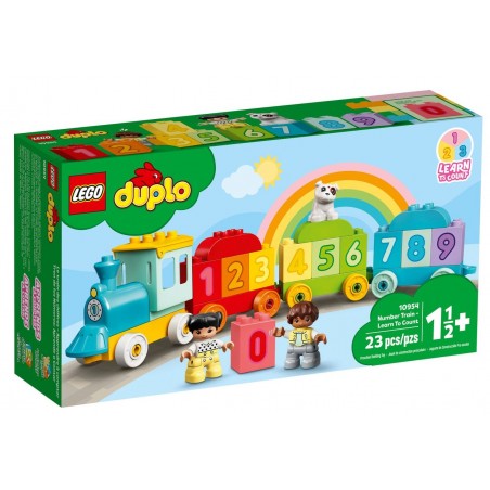 Sube a bordo del Tren de los Números: Aprende a Contar Mi Primer LEGO® DUPLO® (10954). Con los 10 ladrillos numerados que los bebés cargan, descargan, apilan y ordenan, y con las figuras DUPLO de una niña, un niño y un perro, la diversión, el juego y el aprendizaje no tendrán fin.